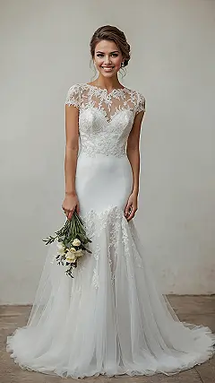 Check out this stunning wedding dress! With its gorgeous lace sleeves and elegant fit, it’s practically begging for a grand entrance. But hold up, it’s not just a pretty face; this beauty is made from sustainable organic cotton. That means it’s super soft and comfy, so you won’t be scratching your way through your wedding photos like you just wrestled a cat. Plus, no weird chemicals, so you’ll feel as fresh as the day you picked out your wedding playlist. It’s like a hug from Mother Nature, but way more glamorous and ready for its close-up!