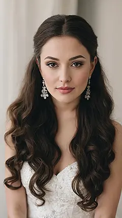This hairstyle is basically the best of both worlds, making it super popular for anyone walking down the aisle. You get to show off all those amazing long waves, just like the ones in the picture, but half of it is elegantly pulled back. This means no rogue strands flying into your lip gloss when you’re laughing or trying to eat cake – a real game-changer! It’s practical enough to keep you comfy and chic, whether you’re taking photos or tearing up the dance floor later without worrying about a hair disaster.