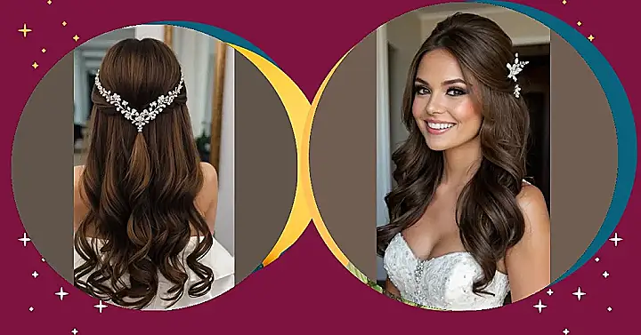 First on our adventure are the half-up styles that offer a blend of elegance and style without compromising comfort. Imagine walking down the aisle with cascading curls while still keeping some hair pinned back. With a crown or a veil adorning your ‘do, you won’t just look beautiful—you’ll feel free as a bird!