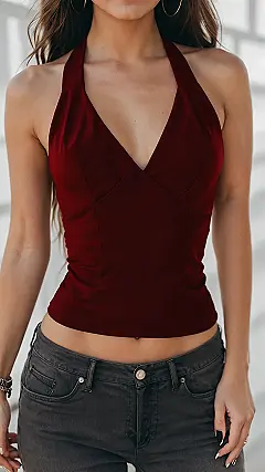 Alright, who knew a red halter top could look so effortlessly cool? This deep, rich color is practically a superpower for your wardrobe, making you stand out like a fashion-forward unicorn in a field of plain tees. It’s got that perfect V-neck cut that says, “I’m stylish, but I also value comfort,” which, let’s be real, is the ultimate goal when you’re trying to look amazing without actually trying too hard. Plus, it’s perfect for showing off those shoulders you definitely didn’t just get from carrying a heavy backpack all week!