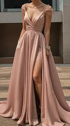 This bridesmaid dress is seriously stunning! Imagine yourself gliding down the aisle, not as the bride (unless you’re secretly planning a surprise elopement!), but as the best-dressed bridesmaid ever. That gorgeous dusty rose color? It’s like a hug for your eyes, and the silky fabric looks so comfortable you might just want to wear it every day. Plus, that high slit? It’s just the right amount of sass and sparkle. You’ll be ready to steal the show, or at least the dance floor!
