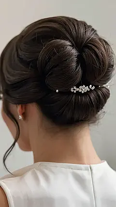 That hairstyle is seriously gorgeous! It’s like a fancy French twist got all dressed up for a wedding. Imagine all the compliments you’d get – “Wow, your hair looks like a work of art!” or maybe even “Did you spend hours on that? It’s amazing!” (Shhh, you don’t have to tell them it only took a few minutes and a sprinkle of magical hairspray.) The sparkly hairpiece is the perfect finishing touch; it’s like adding glitter to a unicorn’s already amazing mane.