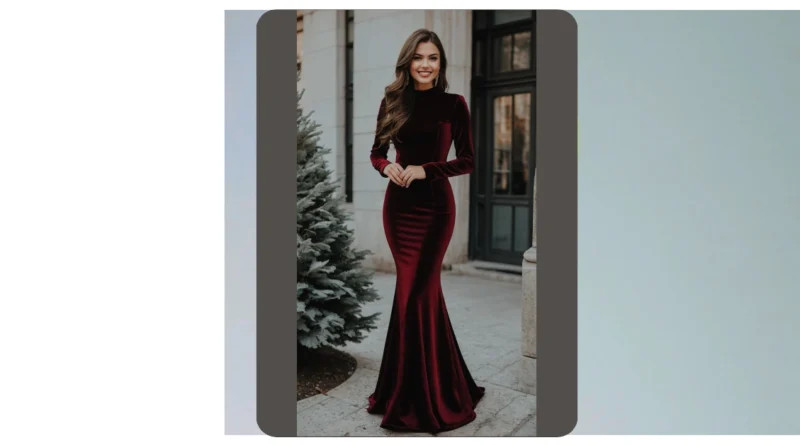 Whoa, talk about making an entrance! This stunning red velvet evening dress is basically a superpower wrapped in luxurious fabric. Wearing this, you’d probably feel like a secret agent disguised as a queen, ready to charm everyone in the room – or at least snag the last slice of pizza at the fancy school dance. It’s got that high-neck, long-sleeve thing going on that says ‘I’m sophisticated, but also, my arms won’t be cold!’ Plus, the way it perfectly hugs and flares out at the bottom? You might even perfect your runway walk just by heading to the kitchen for a snack.