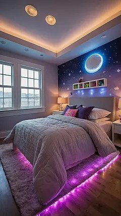 This bedroom looks so cool, it probably requires a boarding pass just to get in! Seriously, who needs a plain old room when you can sleep under your own private glowing moon and a sky full of stars? Forget counting sheep; you’ll be counting constellations while chilling on a bed that looks like it came straight out of a fancy design magazine, complete with funky purple lights underneath that make it feel like you’re floating in a spaceship. Just try not to launch yourself into orbit during a particularly exciting dream!