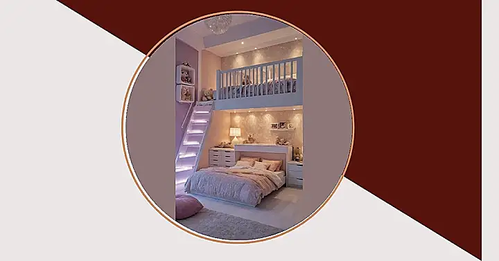 Forget regular bunk beds! This is like a secret VIP lounge for sleeping. Peeking at this room, you might think you accidentally walked into a cloud palace designed just for chilling. Those stairs aren’t just stairs, they’re basically a light-up runway leading you to dreamland, probably feeling super important with every glowing step. It looks so ridiculously comfy and cool, you half expect a butler (maybe a teddy bear butler?) to bring you hot chocolate while you lounge up top like royalty, or maybe just have the best ever pillow fight down below.