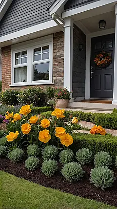This front garden landscape is basically your house’s super-cool, welcoming committee, and honestly, it’s doing a fantastic job! Those bright yellow flowers look like they’re ready to bust out some dance moves, cheering on anyone who walks by. And check out those neat, round green shrubs – they’re lined up so perfectly, you’d think they’re tiny, fluffy bodyguards protecting the secret recipe for eternal sunshine. It’s the kind of front yard that makes you wonder if the homeowner secretly whispers encouraging words to their plants every morning, like “Grow big or go home, petal power!”