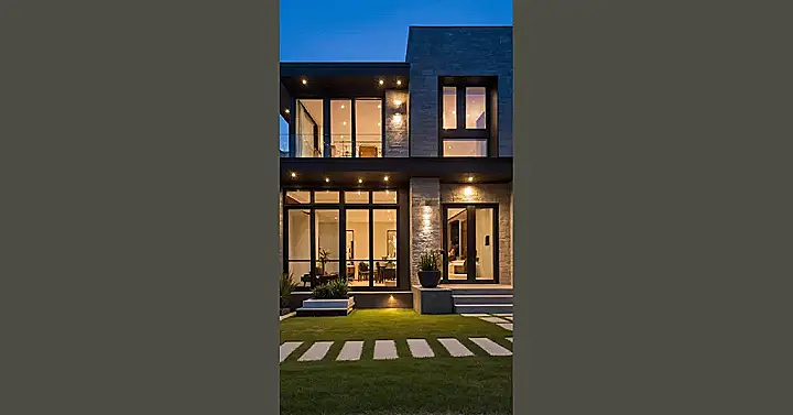 This isn’t just a house; it’s a house that clearly knows a thing or two about making a grand entrance! The front design here is totally flexing with those cool, light-colored stone walls that look like they’ve been perfectly stacked by a master builder. This place looks so put-together, it probably even alphabetizes its spice rack. With the sharp dark trim and cozy glowing lights, it practically invites you to knock and ask if they have any spare Wi-Fi, or maybe a fancy snack, because a house looking this good must have all the good stuff.