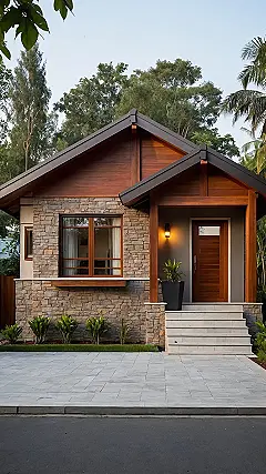 This bungalow house design is so charming, it practically winks at you from behind those lush green trees. With its sturdy stone walls and the cozy wooden siding up top, it looks like it’s straight out of a storybook – but way better, because you can actually live there! Forget those towering, impersonal buildings; this place screams ‘kick off your shoes and stay a while.’ Plus, that little attic window makes you wonder what secret hideouts or epic pillow forts could be lurking inside. Bet it’s got amazing acoustics for a spontaneous dance party, too.
