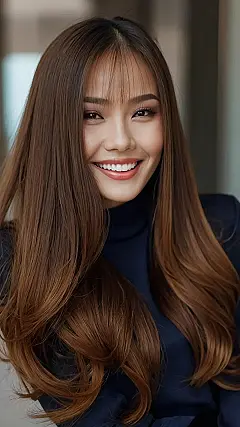 This hairstyle is like a dream! Imagine the feeling of running your fingers through hair as soft as silk. That’s the kind of luxurious feel this hairstyle gives off. It’s like a waterfall of glossy dark brown locks, with just a hint of caramel swirling through, making it look extra dreamy.