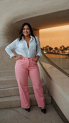 So, you’re thinking about rocking pink jeans? Good choice! These aren’t your grandma’s rose-colored trousers, okay? They’re bold, they’re fun, and they basically scream, “I woke up like this… fabulous!” The picture shows how to totally nail the look. A simple white button-down shirt keeps things classy, and the black heels add a touch of “I’m important” vibes.