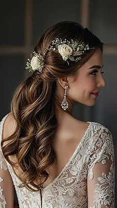 Now, if you’re more of a “down” kind of gal, don’t fret! We also have options that beautifully embrace open hair while incorporating floral details, allowing your locks to cascade elegantly down your back. But let’s not forget the charm of a side swept look, providing romance and sophistication in one fell swoop. The key? Find that perfect balance between your dress and your do, making sure to complement the overall theme of your wedding.