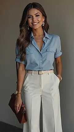 Getting ready for work can feel like a puzzle sometimes, right? You want to look professional but also not feel like you’re wearing a costume. Check out this look: that cool blue shirt and those wide white pants are basically saying, “Yeah, I’m here to handle things, but I’m also comfortable, thank you very much.” It’s like wearing your comfy clothes but upgraded so nobody knows you secretly wish you were still in bed. Finding outfits that feel good and look good is key to tackling the day, whether you’re acing a presentation or just trying to find the coffee machine.