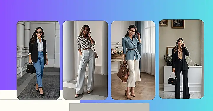 Thinking about professional work outfits might sound like something your parents talk about, but let’s be real, picking out something besides sweatpants for school feels like stepping into a whole new world sometimes! Check out this outfit in the picture – it’s like “Okay, I’m here to conquer the world (or at least this meeting).” Those fancy pants and stylish blouse are basically saying, “Yeah, I woke up like this… after spending ages trying to find my keys and matching socks.” It’s definitely a level up from graphic tees, making you look like you mean serious business, even if your biggest decision of the day is what’s for lunch.