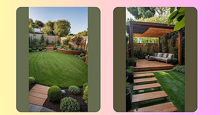 Plus, who needs giant gardens when you can have a setup this slick? Look at that wooden deck area – it’s like its own private island of relaxation under that cool pergola roof. And check out those stepping stones floating over the grass; they just make getting to your epic chill spot feel a bit more adventurous. This kind of small garden design isn’t just squeezing stuff in; it’s making a limited space feel way bigger and packed with cool vibes, basically proving that good things come in smaller, expertly planned packages.