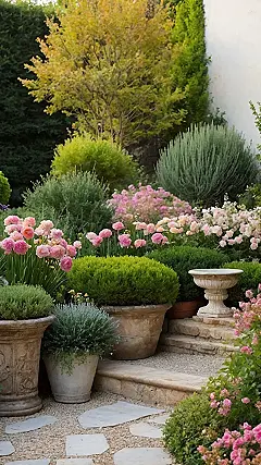 If you’re looking for a chill spot to escape, this garden has totally got you covered. With its rambling stone paths that look like they’ve been there forever and those cool, mossy pots brimming with life, it feels like a secret world. Even the little bird bath looks like it’s seen a few garden parties in its day! It’s the kind of place where the different shades of green are best friends with all the pink flowers, creating a truly epic hangout spot. Forget scrolling on your phone; this garden makes you want to grab a comfy cushion and just soak up all the natural awesomeness.