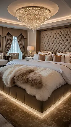 Step into this deluxe room, and you might wonder if you accidentally walked into a fancy movie set! That giant, sparkly chandelier on the ceiling looks like it’s ready to host its own disco party, just for your sleepy head. And get a load of that bed – it’s practically a mountain of pillows and fluffy white blankets, topped with a super soft, furry throw that looks like a cloud made just for napping. You could probably do a cannonball into that bed and just sink into pure bliss, forgetting all about homework and early mornings!