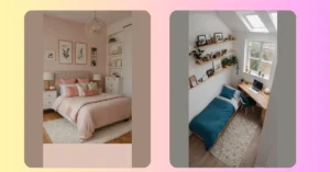 This isn’t just a room; it’s a “no-mess-allowed” zone where even your socks would feel obligated to match. Those cool gold lines on the wall and the soft lighting from the lamps make it look super sophisticated, like a secret hideout for VIPs (Very Important Pro-Nappers, obviously). You could probably finish your history project without distractions here, or just spend hours scrolling through social media feeling extra fancy. It’s so put-together, you’d think twice before throwing your backpack on the floor!