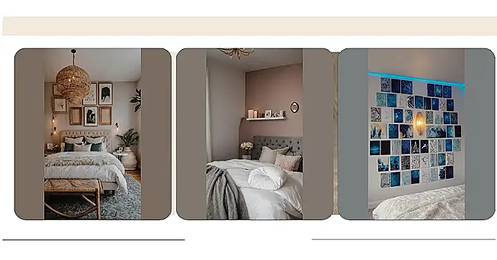 Who needs a plain, boring wall when you can have a full-blown art party happening right behind your headboard? This bedroom wall decor totally nails the cozy-chic look with its epic gallery setup. It’s not just a bunch of pictures; it’s a whole mood! Imagine waking up to a collection of cool abstract prints, heartfelt photos, and even some textured art that makes you go, ‘Whoa, my room is actually stylish.’ It’s giving off serious ‘I’m way cooler than my current laundry pile’ vibes, making your space feel instantly more put-together and ready for those chill-out sessions.