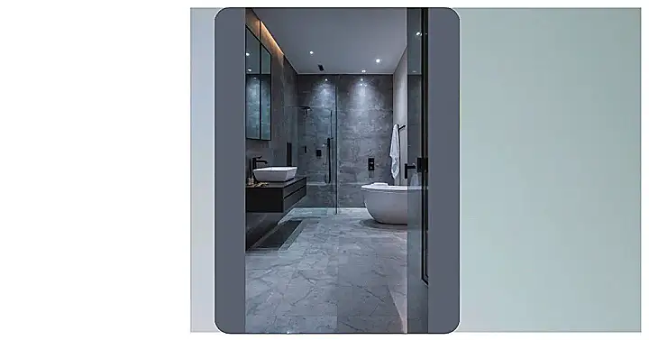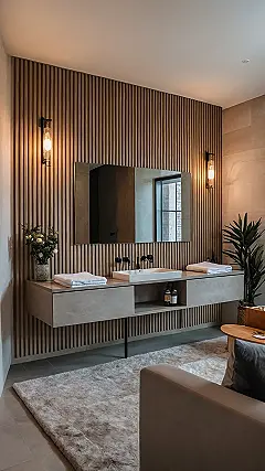 Whoa, hold up – is this even a bathroom or did someone accidentally upload a picture of a five-star spa retreat? The interior design here is so sleek, it practically whispers, ‘You deserve this.’ From the cool, earthy grey tiles that make you feel instantly calm, to the subtle glow behind the mirror that’s basically a permanent ‘good lighting’ filter, this space is designed for ultimate chill. You can almost hear the soft music playing, making even the most basic teeth-brushing feel like a high-end experience. It’s definitely a step up from dodging bath toys and questionable grout in your average home bathroom – this one’s got serious glow-up goals!