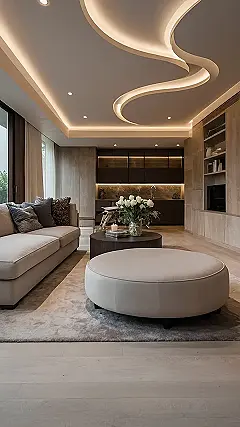 This living room is seriously stunning! Imagine sinking into that comfy sofa after a long day – pure bliss! The swirly ceiling lights are like something out of a spaceship, but the whole thing feels cozy and inviting, not cold and fancy like you might expect from a super-expensive design. It’s proof that you don’t need to sell a kidney to have a home that looks like a million bucks. This shows that stylish doesn’t always mean pricey; a little clever design goes a long way!
