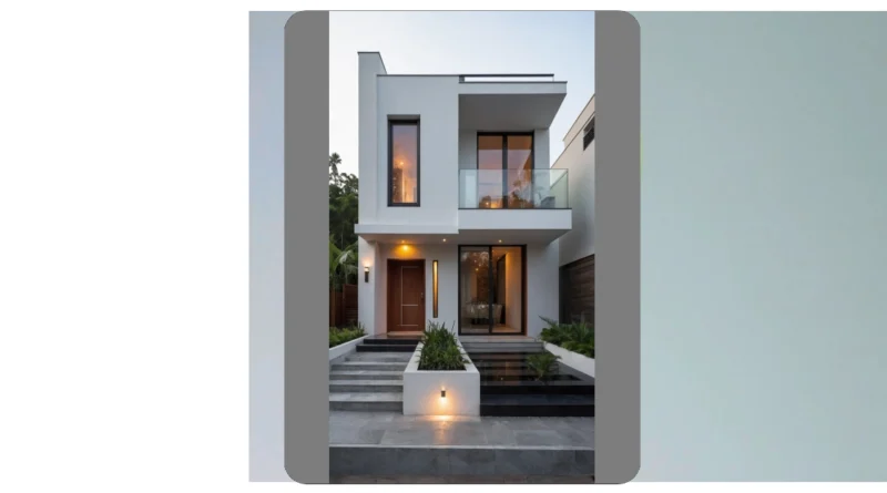 This isn’t just a house; it’s practically a design celebrity showing off its best angles! This super sleek, modern two-story house definitely knows how to make an entrance. With its cool gray exterior and warm wooden accents, it’s got that ‘I’m effortlessly stylish’ vibe that just screams “future goals.” Those glowing lights at dusk? They’re basically saying, “Welcome to the future, where even our driveways look like a red carpet, and every corner is selfie-ready! You can bet your best sneakers this place turns heads!”