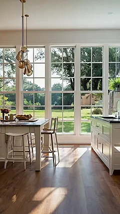 Imagine having a kitchen so neat that you could eat off the floor… though, with a counter like that, why would you? Seriously, this place looks like it’s ready for its close-up! The sunlight streaming in through those massive windows makes everything look extra sparkling. It’s the kind of space where you could totally see yourself baking a cake, or maybe just grabbing some fruit from that bowl, and not feeling guilty about the crumbs because you know you’ll clean them up right away.