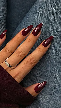 This hand isn’t just about the nails; it’s a whole mood! Check out how the sparkly gold ring, rocking its own little maroon gem, totally matches the nails. It’s like they’re best friends who got ready together. And that fluffy white sweater? It screams ‘cozy chic’ – perfect for showing off your awesome mani while still being comfy enough to binge-watch your favorite show. So, if you’re ready to add a touch of fancy without sacrificing comfort, these maroon nails are basically your personal style superhero ready to save the day (and your outfit!)