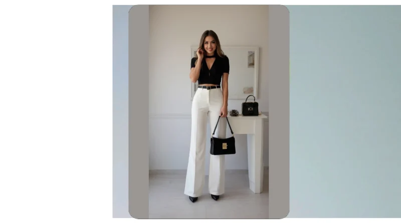 This outfit is basically a masterclass in looking effortlessly put-together. See how the cropped top perfectly balances the flowy trousers? It’s like they were made for each other – a fashion match made in heaven! And let’s not forget the accessories: the little black bags and pointed shoes add a touch of ‘I mean business, but also I’m fun’ vibe. Whether you’re heading to a school presentation where you want to impress, or just pretending to run a mega-corporation from your bedroom, these women’s trousers outfits are ready to make you feel like the coolest person in the room (without actually having to be a CEO… yet!).