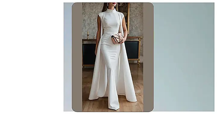 Behold, the ultimate “I woke up like this, but totally fancy” outfit! This chic white dress is practically a superhero cape in disguise, making anyone feel like they’re about to accept an award or casually float into a royal ball. With its sleek high neck and those flowing shoulder panels, itโs not just a dress; itโs an entire vibe, proving you can be super classy without needing a crown (though one would totally match the energy!). This dress whispers “sophisticated” while also screaming “ready for anything, especially if ‘anything’ involves looking fabulous.”