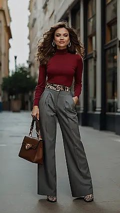 And let’s talk about that pop of leopard print! Who knew animal print could be so sophisticated? It’s like saying, “Yeah, I’m stylish, but I’m also not afraid to have a little fun.” The whole look is actually super easy to put together, too. Grab your favorite turtleneck, some wide-leg pants, add a cool belt and a bag, and BAM! You’re ready to conquer the world, one stylish step at a time.