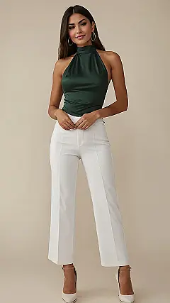 This outfit is basically a masterclass in looking effortlessly amazing. Our model is rocking a sleek, emerald green halter top that practically screams “I’m here, and I brought my A-game!” Paired with those crisp, wide-leg white pants, it’s the kind of look that makes you feel like you’re starring in your own movie montage, even if you’re just walking to get a snack. It proves you don’t need sleeves to look super sophisticated; sometimes, a chic neckline is all the drama you need to make a statement and look totally put-together.