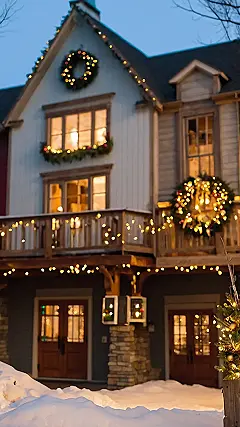 Seriously, whoever decorated this place deserves a giant candy cane and a lifetime supply of eggnog. The combination of the warm lights, the beautiful wreaths, and the fresh snow is absolutely stunning. It’s the kind of Christmas spirit that makes you want to grab a mug of something warm and go caroling (or maybe just snuggle up by the fire – we won’t judge!). You can practically feel the festive cheer radiating from this image; it’s truly the perfect example of how to bring outdoor Christmas decorations to life!