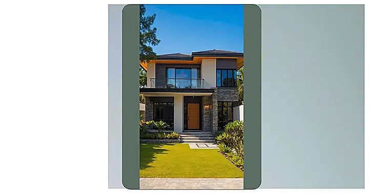 Stepping up to this front door, you might do a double-take, wondering if you accidentally wandered onto a fancy resort instead of a regular neighborhood! This house’s front design is practically a masterclass in ‘wow factor,’ with its super clean white walls that look like they’ve never seen a smudge. The giant archway on the second floor isn’t just a balcony; it’s like the house is giving a permanent, stylish wink to everyone who passes by, saying, “Yeah, I’m this cool.” Plus, with those big windows, you’d never miss the drama of a perfectly cloudy sky, or maybe just what your neighbor’s up to.
