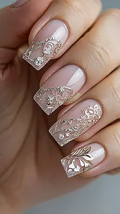 These aren’t just nails; they’re tiny, portable art galleries ready for their close-up! With a chic nude base that’s perfect for any sweater weather, these beauties take “fall fashion” to a whole new level of sparkle. We’re talking delicate silver swirls that look like they’ve been spun by a fairy godmother, complete with tiny rhinestones that probably cost more than our entire back-to-school wardrobe. You might need to hire a bodyguard for your fingertips, because these gems are definitely stealing the show, even if you’re just grabbing a pumpkin latte.
