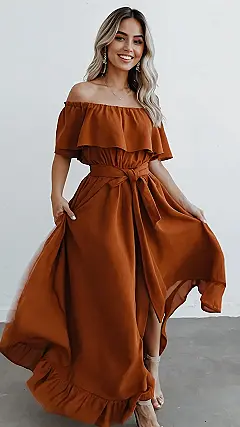 This dress is like a warm hug on a chilly autumn day. It’s long and flowy, perfect for those cozy vibes, and the color is like a beautiful sunset that makes you want to sip hot cocoa and listen to the crunch of leaves under your feet. It’s like a reminder that even though the days are getting shorter and the weather is turning colder, there’s still beauty to be found in every season. It’s a reminder that autumn isn’t just about pumpkin spice lattes and spooky costumes, but also about feeling comfortable and chic while the leaves turn all shades of red, yellow, and orange. With this maxi dress, you can be the coolest kid on the block – literally!