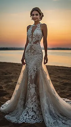 Wedding dresses can be so extra, right? But this one is cute and not like you are wearing a million pounds. It’s got that sheer part at the top, so you can stay cool while still looking super elegant. Think of it as the perfect mix of Cinderella and, like, a chill beach goddess. Now all you need is a super cool flower crown and maybe some shades.