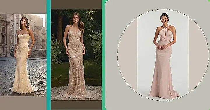 This stunning number is basically what happens when a secret garden decides it’s time for a glow-up and becomes a classy evening gown. With all those delicate lace flowers and that perfect champagne color, it’s so elegant you might just start curtsying without realizing it! This isn’t your average “pizza night” attire, unless your pizza night involves a red carpet and a personal chef. It’s the kind of dress that makes you stand a little straighter and probably reminds you to use your indoor voice, even if you’re just trying to figure out if there’s any cake left.