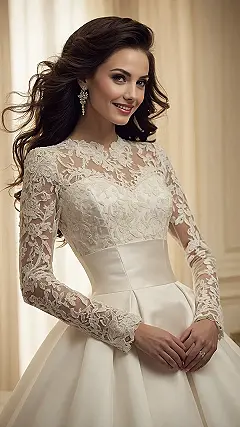 Those long, lacy sleeves are definitely giving off major elegant vibes, perfect for twirling or maybe just subtly showing off your best dance moves. And notice her smile? That’s the look of someone who knows she’s wearing a dress that’s not only beautiful but also probably pretty fun to wear, despite all that gorgeous fabric. Just be careful not to accidentally sweep up any stray confetti with that magnificent skirt when you hit the dance floor! It’s all about looking fantastic while maybe also being a tiny bit of a human dust mop.