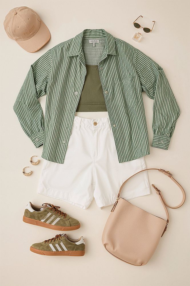 Elevate your `spring and summer outfits` with this impeccably styled flat lay, epitomizing `chic spring outfits 2026`. Featuring a fresh green and white striped button-up over an olive tank, paired with crisp white denim shorts and matching green sneakers.