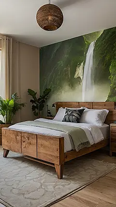 Imagine chilling in this bedroom – it’s like having a super chill camping trip without the bugs! Everything from the leafy plants to the earthy colors gives off major nature vibes. The bed looks super comfy, perfect for catching up on sleep after a long day of, well, anything! Who needs a fancy hotel when you can have your own indoor forest getaway?