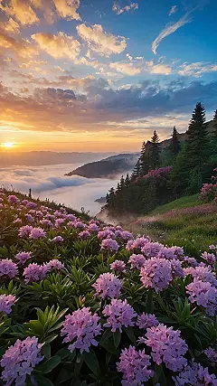 Those gorgeous flowers in the foreground are practically waving at you, saying, “Hey, put us on your phone, we promise to brighten up your day!” And let’s talk about that epic cloud situation – it’s like the mountains are wearing a cozy, oversized scarf made of mist, making everything look just a little bit magical. You almost expect a friendly unicorn to poke its head out of the fog! This scene has so much chill vibe and stunning color that it’s basically begging to be the background that makes all your apps look extra fancy. Who needs boring plain screens when you can have this slice of natural perfection?