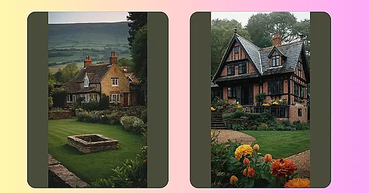 This charming English village house looks straight out of a fairytale! With its thatched roof, timber framing, and adorable front porch, it’s easy to imagine a cozy family living here, maybe with a mischievous cat or two! The house is surrounded by lush greenery, creating a peaceful and inviting atmosphere. You can almost hear the birds chirping and smell the fresh air!