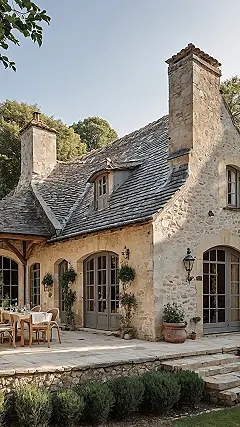 This place looks like it popped right out of a storybook, the kind with cobblestone streets and maybe a baker selling croissants down the lane. Forget those boring, identical houses; this French cottage is basically the definition of ‘charming overload’. It’s got these cool stone walls that probably have a zillion stories trapped inside them and a roof that looks like giant, fancy scales. You can practically feel the history soaking into the walls, and that patio just screams “fancy outdoor snacks time.” It’s the kind of place where you expect birds to help you get dressed in the morning, honestly.