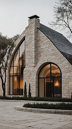 This house clearly got tired of being a boring old box and decided to embrace its inner circle! Just check out those magnificent arched windows – they’re not just big, they’re practically giving the sun a high-five as it streams into what must be the coolest living room ever. Forget bumping into sharp corners; this place is all about those smooth, graceful curves, making it look like a fancy stone fortress that secretly wants to be a giant, cozy igloo. You could probably host the most epic movie night in here, with natural light until the stars come out, or maybe just wave at passing birds from your super high-up window.