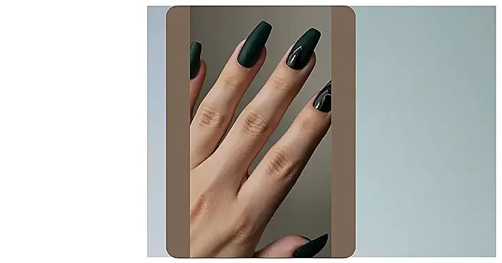 These nails are giving us major fall vibes! They’re like the perfect blend of spooky and chic – imagine you’re walking through a dark forest, but instead of being scared, you’re rocking a super stylish look. The deep green is like the fall leaves, and the black accents make it feel a little mysterious. It’s like you’re saying, “I’m ready for Halloween, but I’m still gonna look amazing.”