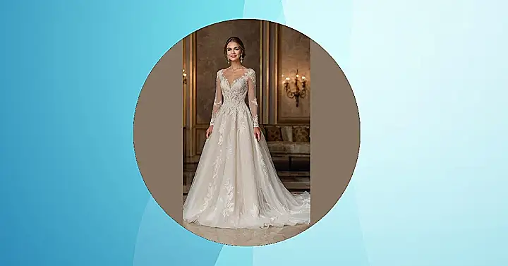 Plus, that high neckline is kinda genius. No need to worry about your grandma pinching your cheeks all day because she can’t reach! And let’s be real, those sleeves are way more stylish than those weird puffy ones you see sometimes. This dress is the perfect combo of fancy and comfy – because who wants to be uncomfortable on their big day? Definitely not me!