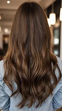 Looking at this hair is like discovering a secret treasure chest of chocolate and caramel. It’s got those amazing wavy layers that look so glossy and healthy, you almost want to ask for its skincare routine. This isn’t just hair; it’s a whole vibe, a ‘rich brunette’ masterpiece that probably gets compliments from strangers on the street. Seriously, it looks like it smells fantastic and has its own theme music.