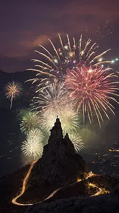 A wallpaper this good isn’t just eye candy; it’s a whole vibe! Think of all those dazzling bursts of light as your personal cheer squad, reminding you to shine extra bright this year. And that cool, winding road snaking up the mountain? That’s totally you, navigating your way through all the fun adventures and successes heading your way in the New Year. This wallpaper is basically your daily reminder to embrace the sparkle, conquer those goals, and make every single day feel as exciting as a firework display!
