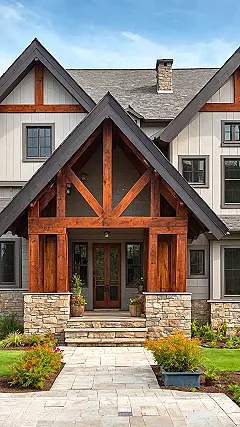 Stepping up to this farm house design, you almost expect a friendly golden retriever to greet you at the door, wagging its tail a mile a minute. Those huge, handsome wooden beams look like they’re giving the whole place a giant, cozy hug, making it feel super inviting even before you ring the doorbell. With that warm, glowing light spilling from the windows, it’s clear this house isn’t just a building; it’s practically begging you to come in, kick off your shoes, and maybe accidentally spill popcorn on the couch during a movie marathon.