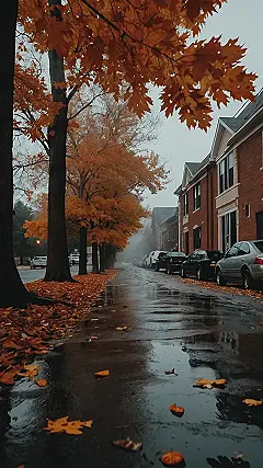The image shows a street lined with trees. The leaves are a beautiful, vibrant orange, and they’re scattered all over the ground. The street is wet from the rain, and there’s a puddle reflecting the colorful leaves. It looks like a perfect autumn day – not too cold, not too hot, and just a bit misty. It’s the kind of day where you could curl up with a good book and a warm drink, and just enjoy the changing season. Honestly, this picture makes me crave a pumpkin spice latte and a warm fuzzy blanket!